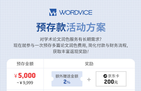 预存金额和额外赠送金额,将于我司收到您个人或单位的付款之后,立刻存入您的账户;京东卡将于付款之日起次月14日之前发放给您;届时您都将会收到来自edit@wordvice.cn客服信箱的邮件通知,请您注意查收和确认。